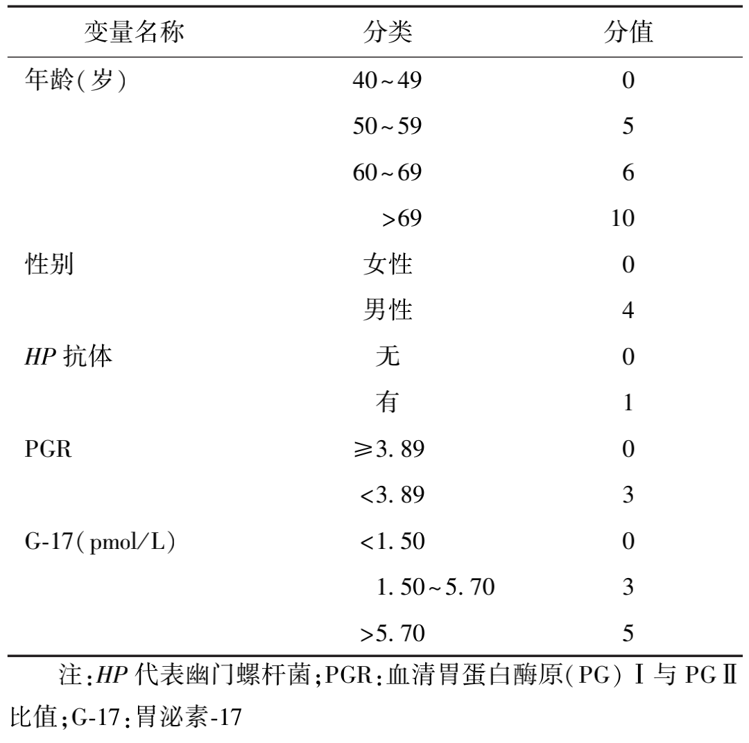 此外,中国早期胃癌筛查流程专家共识意见(草案,2017年,上海)建立了新的胃癌筛查评分系统,该系统包含5个变量,总分0~23分,根据分值可将胃癌筛查目标人群分为3个等级:胃癌高危人群(17~23分),胃癌发生风险极高;胃癌中危人群(12~16分),有一定胃癌发生风险;胃癌低危人群(0~11分)胃癌发生风险一般。