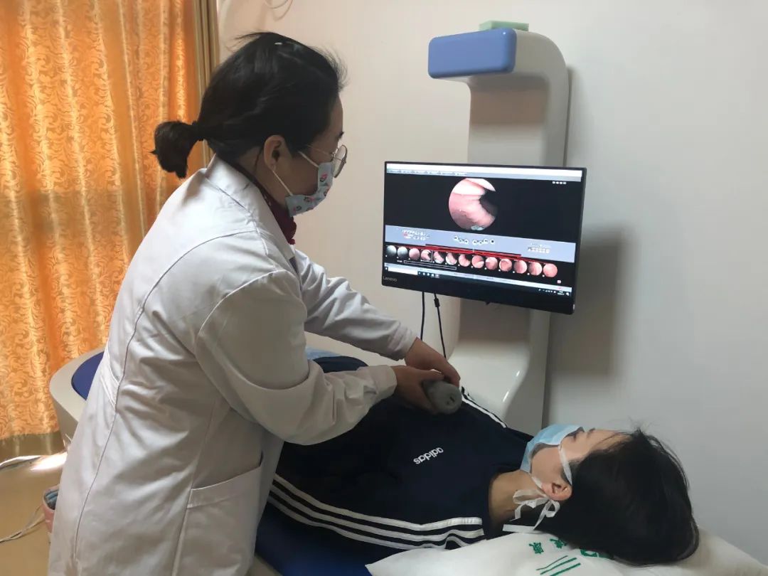医生对患者胃部胶囊胃肠镜进行姿态控制,通过电脑显示屏察看患者胃部影像,进行精准诊断。—— 淮南济民医院体检中心