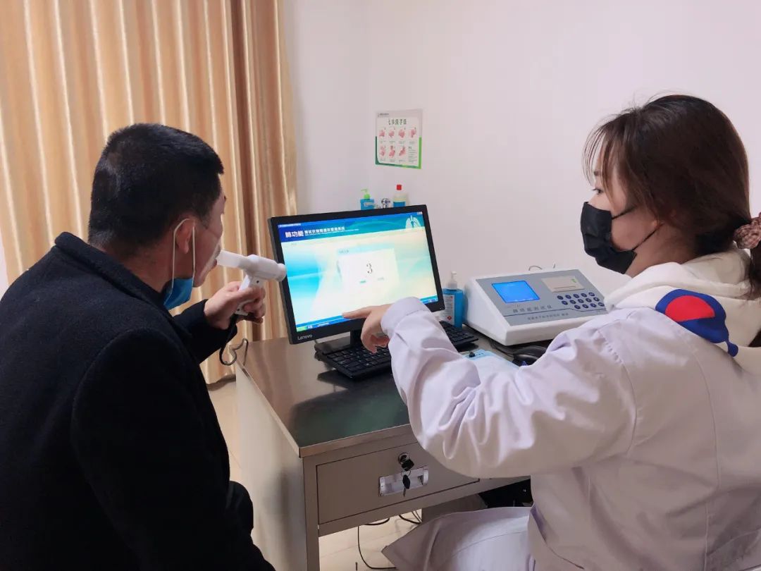 医生正在指导体检人员吹气检查肺功能,收集体检人员肺功能测试数据。—— 淮南济民医院体检中心