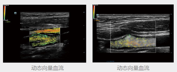 通过彩色编码的向量箭头来追踪血流速度的大小和方向,生动且准确地显示外周血管的血流动力学特征,包括血管的管径、走行、分布和血管的丰富程度。依靠其高性能的彩色多普勒超声功能,能够显示直径在两毫米以下的细小血管,以及低速血流、低流量的血流,用于评价脏器血流灌注和病灶的血供特点,且无角度依赖,是极具价值的血流动力学研究工具。