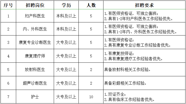 1.医疗、医技、护理、行政类人才需具备相应岗位工作经验。2.遵守法律法规,具有良好的政治素养,无违法违纪记录。3.热爱本职岗位,能吃苦耐劳,有良好的服务意识。医疗、医技、护理类招聘岗位及要求